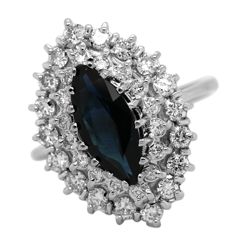 Gezet met 1 marquise geslepen natuurlijke saffier (5 x 12 mm) en 34 natuurlijke rond briljant geslepen diamanten met een geschat totaalgewicht van 1,39 ct.
